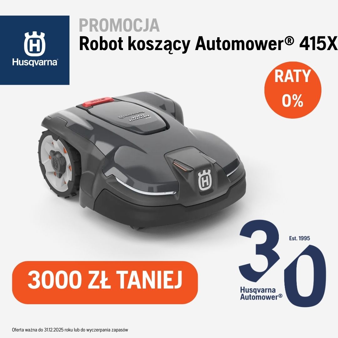 Tylko teraz, z okazji 30 lecia wprowadzenia na rynek robotów koszących Automower®Husqvarna 415X taniej o 3000 zł. Oferta ważna do 31-12-2025 roku lub do wyczerpania zapasów.